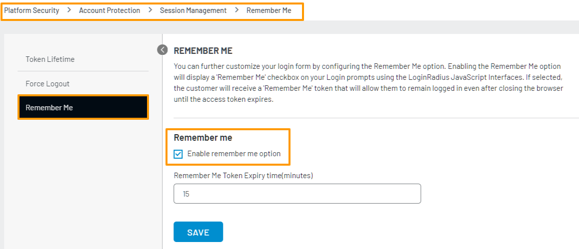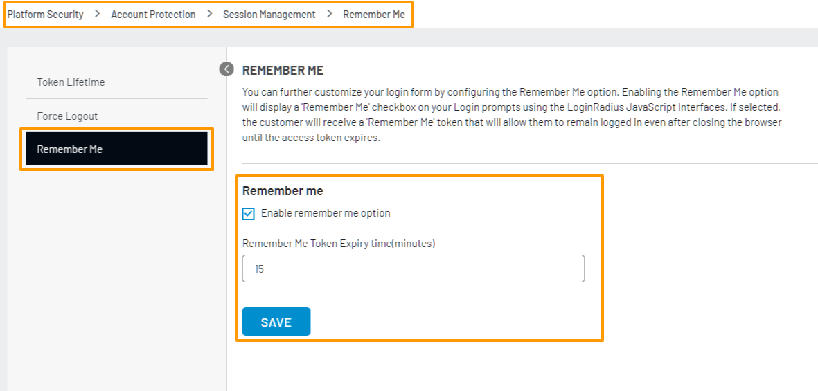 Step 3: Enter the Remember Me Token Expiry time and click the Save button, as highlighted in the following screen: