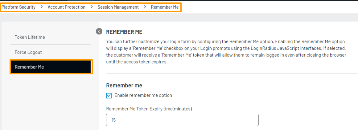 Step 1: Login to your Admin Console account and navigate to Platform Security > Account Protection > Session Management > Remember Me.