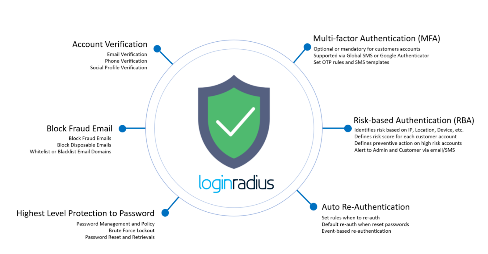 Customer Security details the multiple solutions LoginRadius offers to secure your platform, to prevent fraud by providing, block fraudulent domains, password management to managing token lifetime, Captcha settings, Force Lockout, Remember Me feature, Risk-based authentication, Multi-Factor Authentication and more. Further detail is available on our Fraud Prevention On The LoginRadius Platform documentation. These authentication features ensure your web properties’ security during registration and login while protecting your customer’s account and identity. Below is a high-level overview of how the fraud prevention and relative features work in LoginRadius.